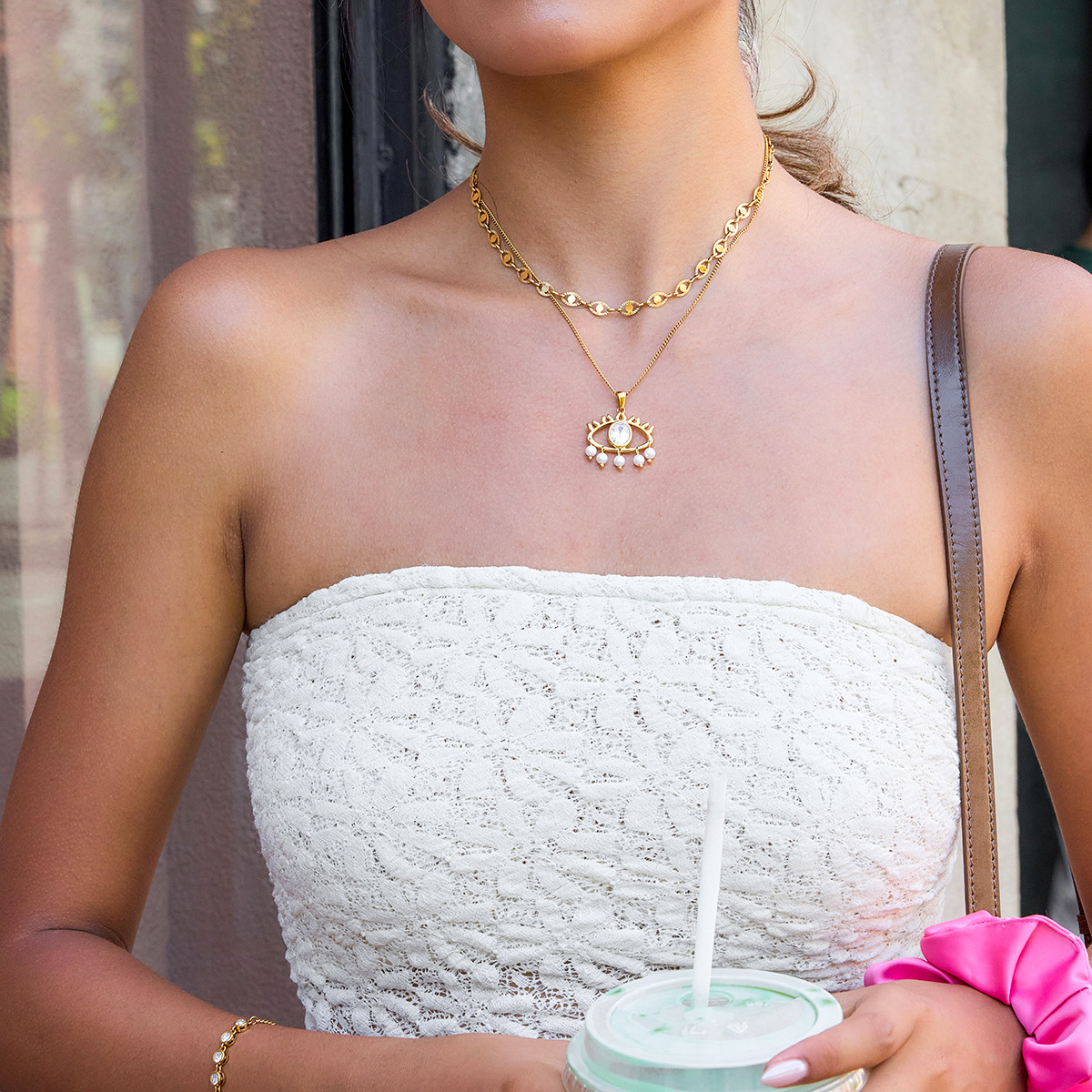 Golden Eye - shaped Pendant Necklace with Pearls