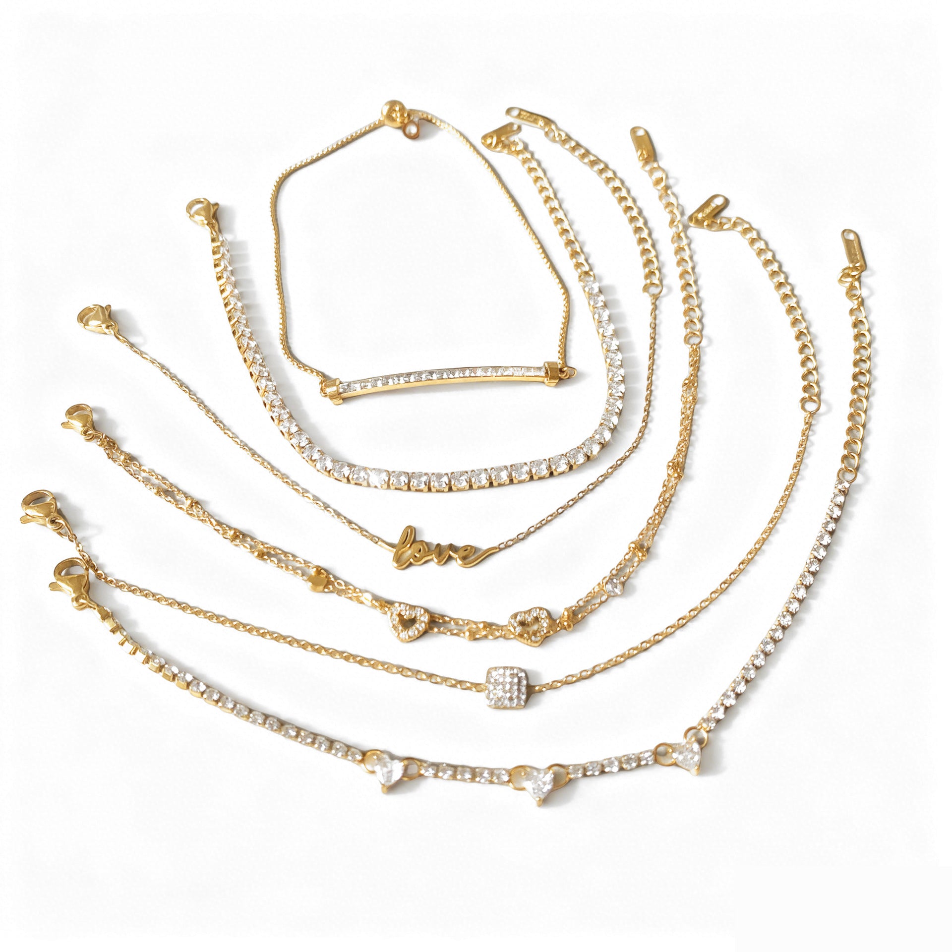 Elevate your style with our exquisite set of layered bracelets for women. Each bracelet features delicate gold - tone chains adorned with sparkling diamonds and charming charms, including a heart - shaped charm and a "love" script charm. The combination of elegance and playfulness makes these bracelets perfect for any occasion, whether it's a special event or everyday wear. Mix and match them to create your unique look.